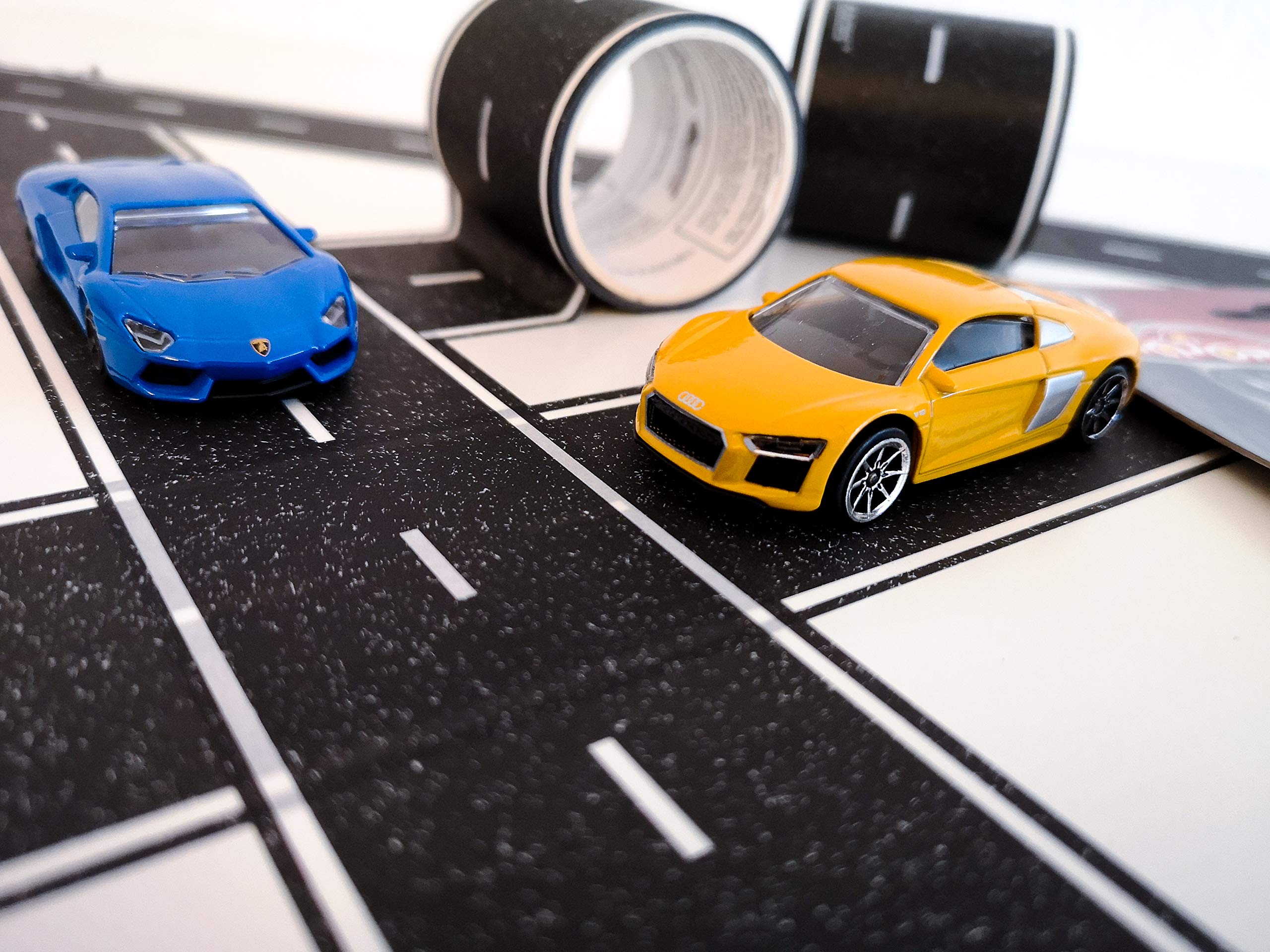 Les enfants adorent les circuits de voitures, mais les grands tapis prennent trop de place ? Découvre le Playtape de Majorette ! Ce mega coffret génial contient 5 rouleaux de ruban adhésif spécial (soit plus de 20 mètres au total) qui sert à créer des routes sur n'importe quelle surface plane et lisse : sol, table, meuble... Le ruban est anti-trace et repositionnable, donc il s'enlève facilement sans abîmer et tu peux créer des circuits différents à l'infini ! Le coffret comprend aussi 10 superbes voitures miniatures en métal à roue libre (des modèles célèbres comme la Lamborghini Aventador, Porsche, Jeep...), ainsi que des panneaux de signalisation pour compléter le jeu. C'est parfait pour développer l'imagination et la motricité fine des enfants à partir de 3 ans (attention aux petites pièces). Les voitures sont solides et de bonne qualité. Un jeu créatif, transportable (tu roules le ruban), et qui ne finit pas à la cave après une semaine. Idéal pour les petits passionnés d'autos, pour jouer seul ou à plusieurs. Des heures de jeu garanties !